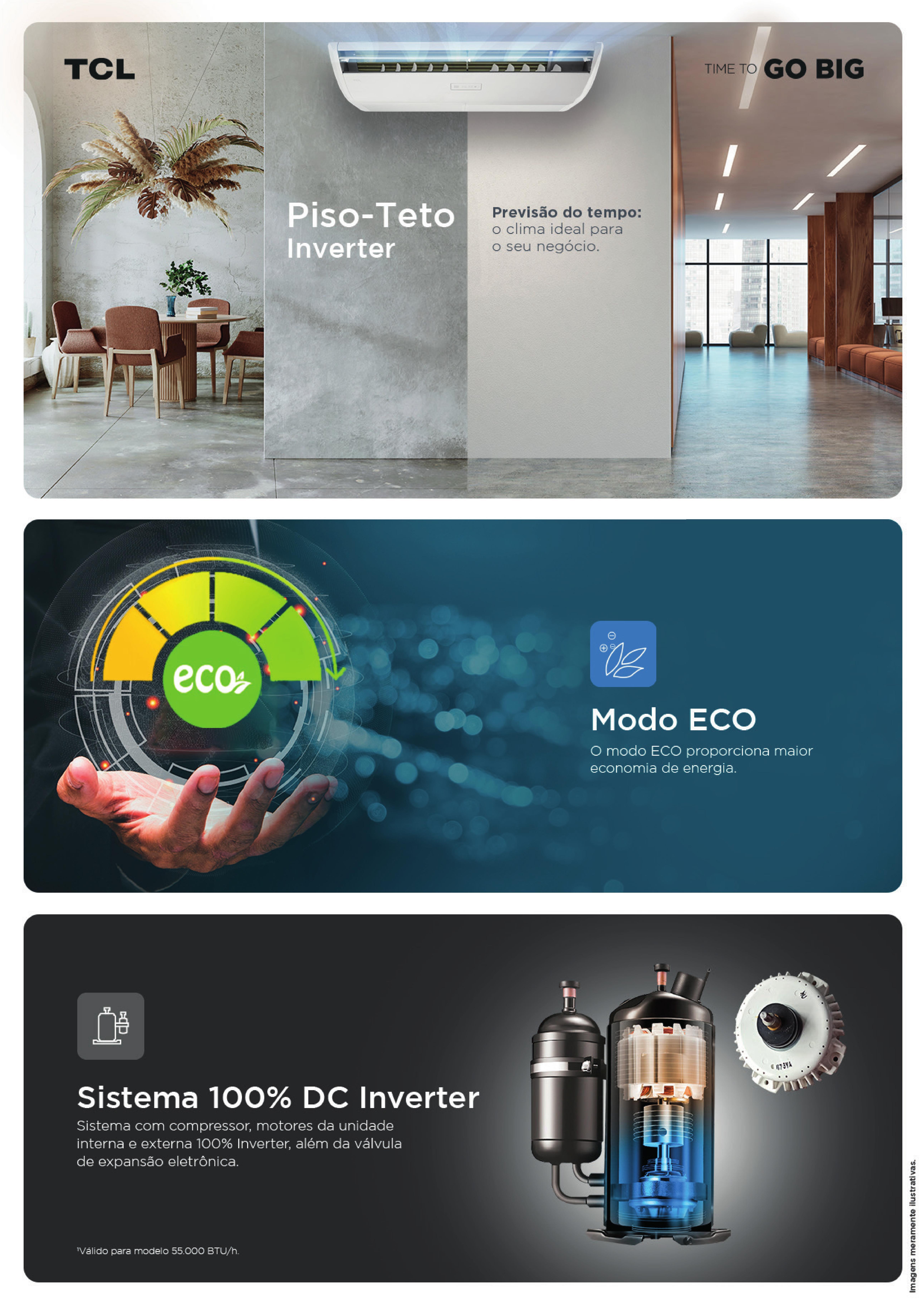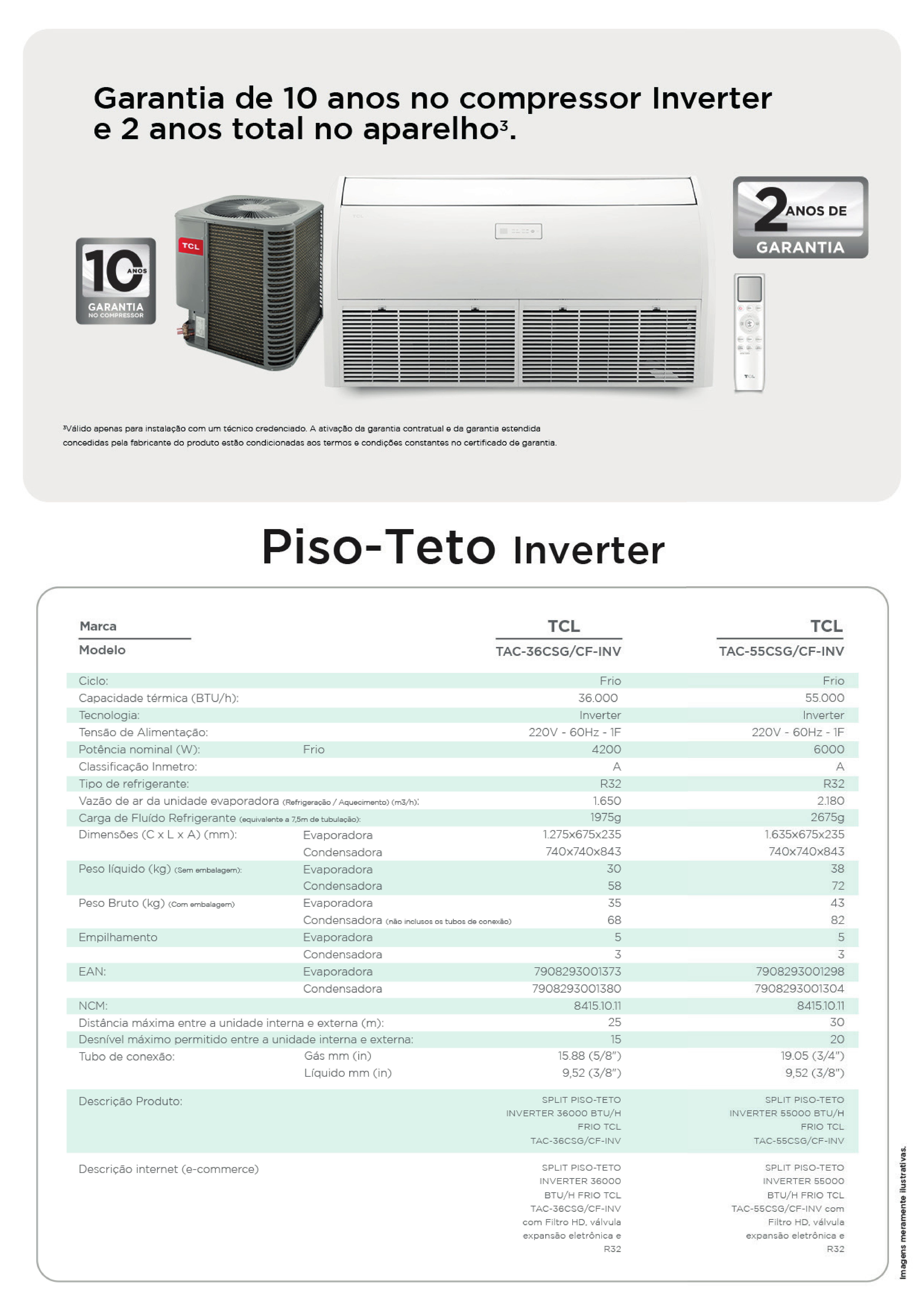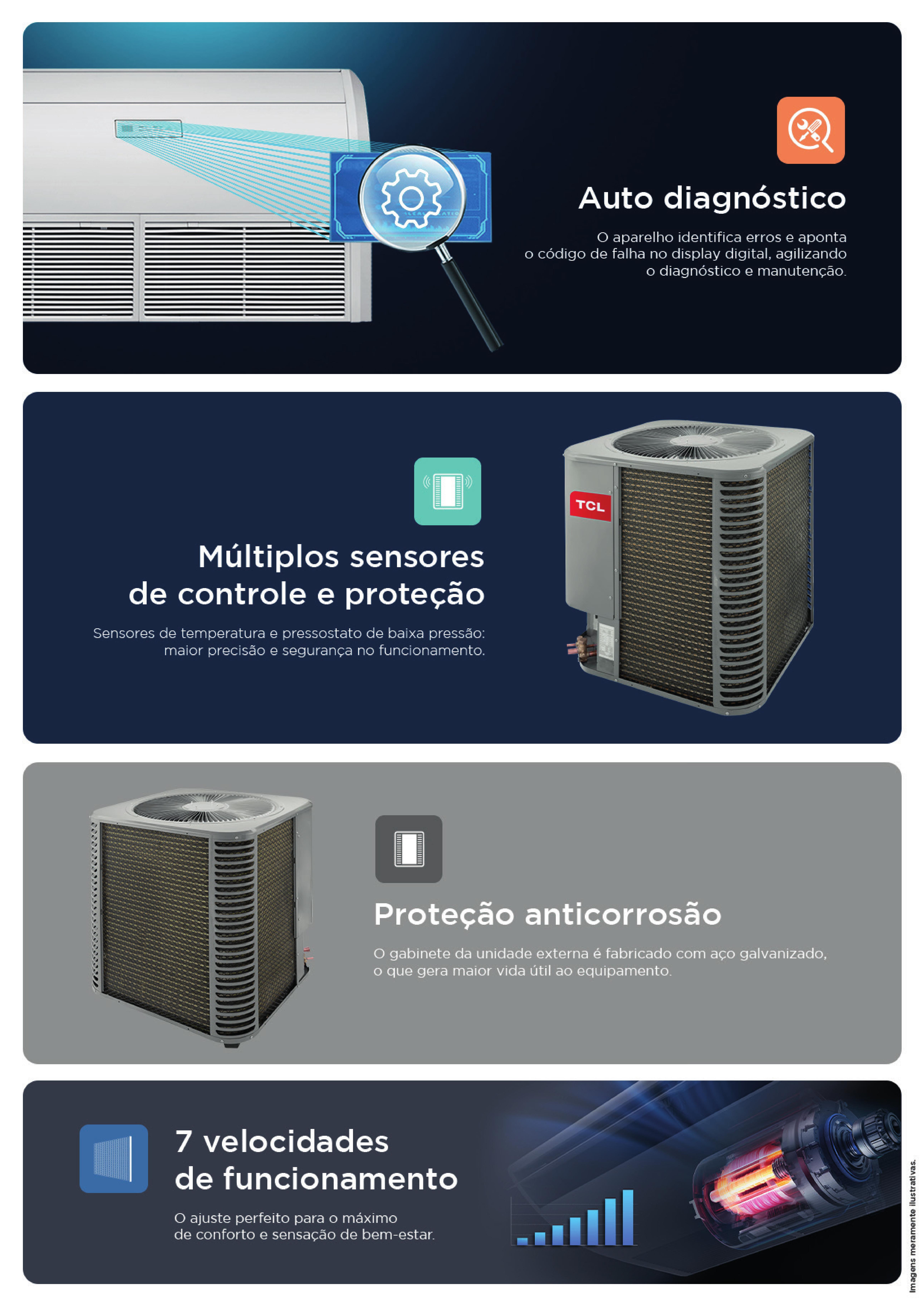 O Ar-Condicionado Split Piso Teto Inverter é o lançamento da TCL para climatização em grandes ambientes. Conta com compressor 100% inverter, além de válvula de expansão eletrônica. Sua serpentina em cobre garante maior resistência e durabilidade da unidade externa, especialmente em ambientes agressivos. O gabinete da unidade condensadora é fabricado em aço galvanizados, o que gera maior vida útil ao equipamento.